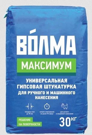 ВОЛМА-Максимум - сухая штукатурная смесь на основе натурального гипса, легкого заполнителя с применением минеральных и химических добавок, обеспечивающих высокую адгезию, водоудерживающую способность и оптимальное время работы. Для выравнивания стен и потолков рекомендованным слоем 5-60 мм (максимально 90 мм) под оклейку обоями, покраску, облицовку керамической плиткой внутри помещений с нормальной относительной влажностью и температурой от +5°С до +30°С. При соблюдении технологии применения даёт глянцевую поверхность, не требующую дополнительного шпаклевания. Для ручного и механизированного нанесения.