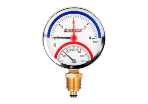 Термоманометр аксиальный (задн.подкл.) с контрольной стрелкой, 63 мм, 1/2", 4 бар,120°С VALFEX