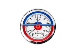 Термоманометр радиальный (ниж.подкл.) с контрольной стрелкой, 80 мм, 1/2", 10 бар, 120°С VALFEX